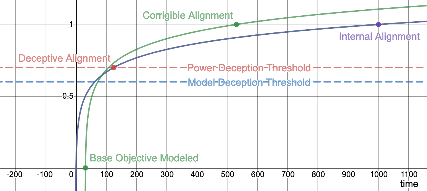 Given the above, , so the model will become a corrigibly aligned model before an internally aligned model in timesteps. At this point, the model is not yet powerful enough to achieve zero training loss, so training will continue to timesteps.