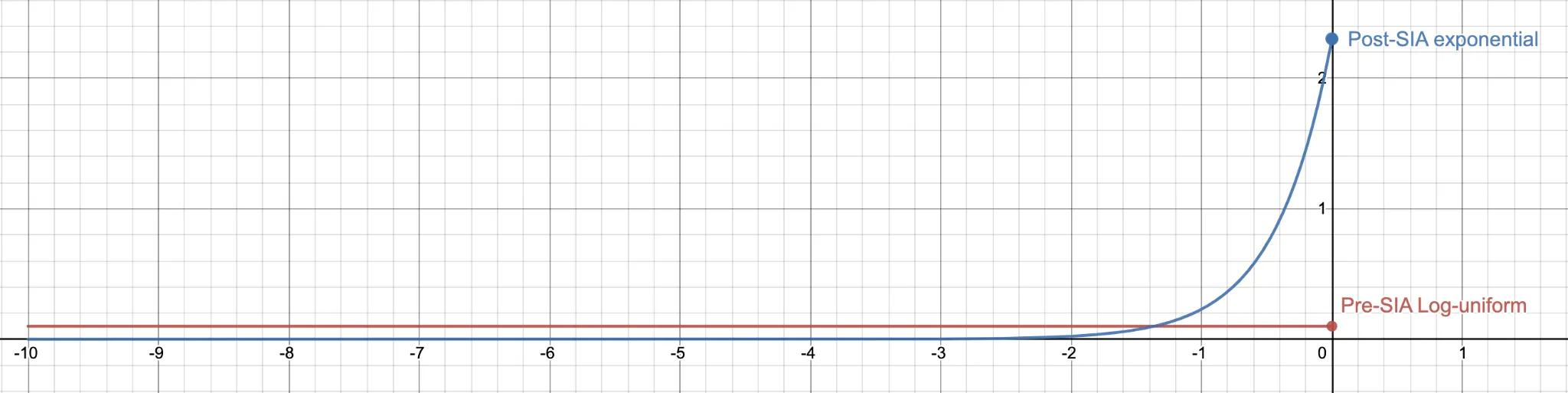 SIA places linear pressure on to be large (and thus also on to be small); at each stage, SIA assigns ten times higher probability to worlds in which is ten times as large. If, for example, one requires that and one’s uncertainty over is log-uniform from to , SIA would exponentially favor falling into higher orders of magnitude, concentrating almost all probability mass on relatively high values of (and thus on low values of ). Here is the update illustrated graphically: (https://web.archive.org/web/20250713044714/https://www.desmos.com/calculator/8baeummm7y)